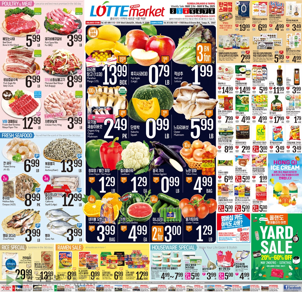 이번주 프로듀스 코너에서는 마라톤 망고(12과) BOX 13.99, 후지사과(대) LB 0.79, 적상추 3BN FOR 1.99, 유기농 새송이버섯 PK 2.49, 단호박 LB 0.99, 느타리 버섯 LB 5.99, 피망 LB 1.29, 컬리플라워 EA 1.29, 중국가지 LB 0.99, 노란 양파 BAG 4.99, 네이블 오렌지 BAG 3.99, 수박 EA 4.99, 미니오이 2 PK FOR 3.00, 줄기토마토 LB 1.29에 판매된다.