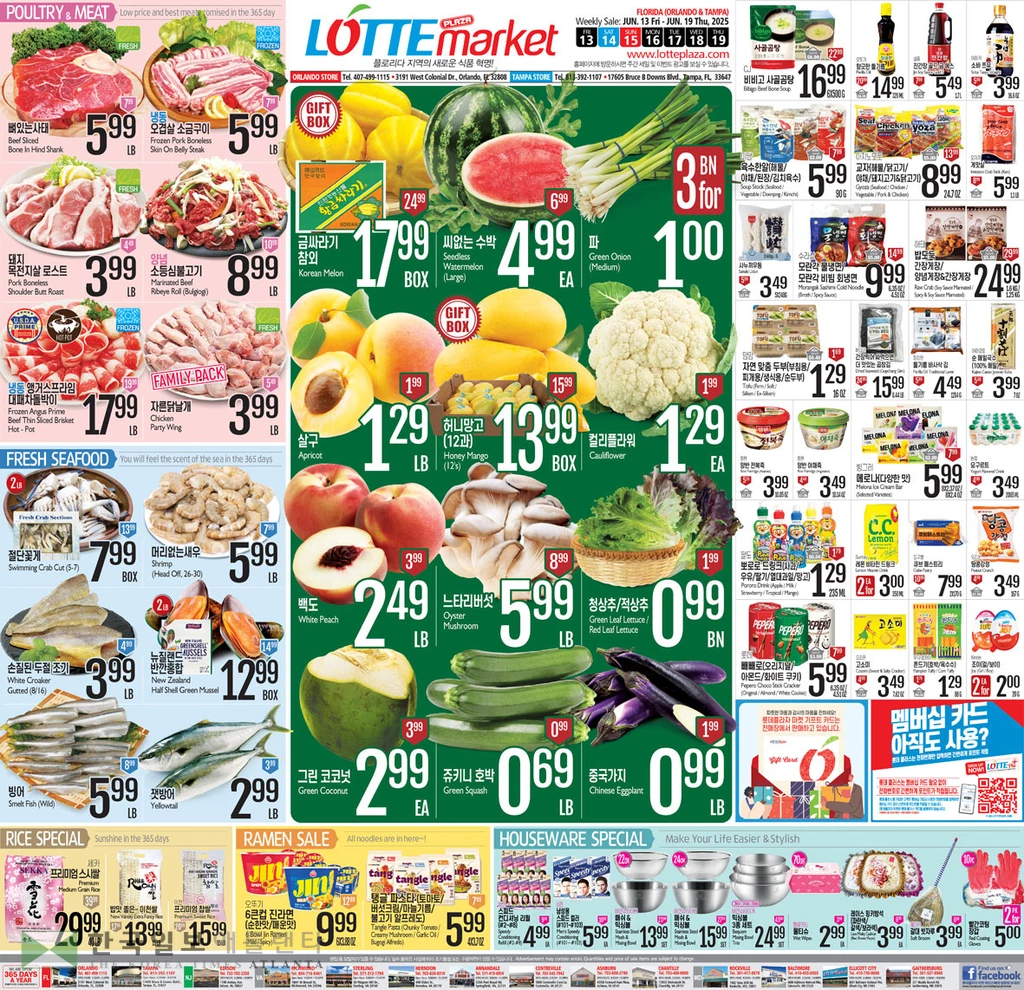 이번주 프로듀스 코너에서는 금싸라기 참외 BOX 17.99, 씨없는 수박 EA 4.99, 파 3BN FOR 1.00, 살구 LB 1.29, 허니망고 (12과) BOX 13.99, 컬리플라워 EA 1.29, 백도 LB 2.49, 느타리버섯 LB 5.99, 청/적상추 BN 0.99, 그린 코코넛 EA 2.99, 쥬키니호박 LB 0.69, 중국가지 LB 0.99에 판매된다.