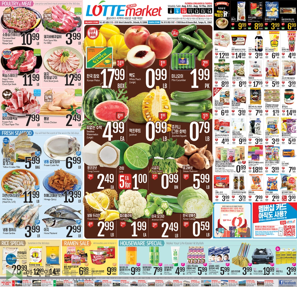 정육 코너에서는 말복 스페셜로 양념 벌집 소등심 스테이크 LB 10.99, 돼지 바베큐 갈비 LB 3.99에 선보이며 앵거스 프라임 목심 스테이크 LB 11.99, 돼지항정살 구이 LB 12.99, 냉동 돼지대패목살 LB 7.99, 통닭 LB 2.49에 공급된다.