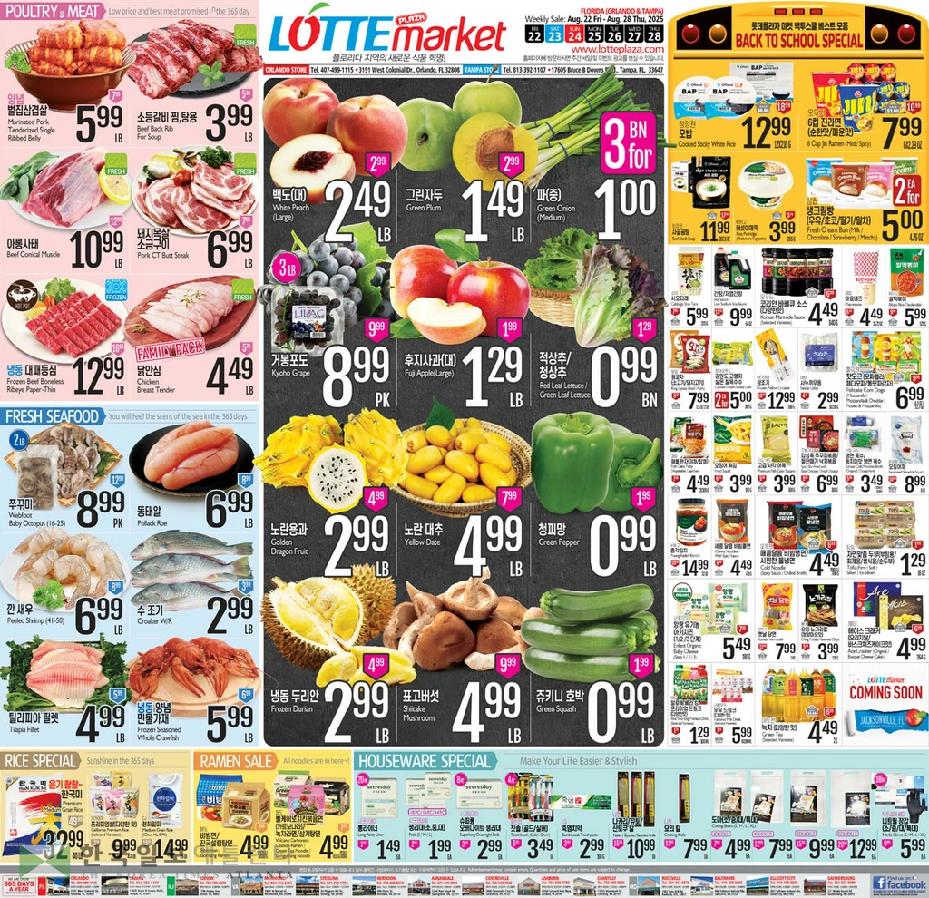 프로듀스 코너에서는 백도 (대) LB 2.49, 그린자두 LB 1.49, 거봉포도 PK8.99, 후지사과 LB 1.29, 적상추/청상추 LB 0.99, 노란용과 LB 2.99, 노란대추 LB 4.99, 청피망 LB 0.99, 냉동두리안 LB 2.99, 표고버섯 LB 4.99, 쥬키니 호박 LB 0.99에 판매된다.