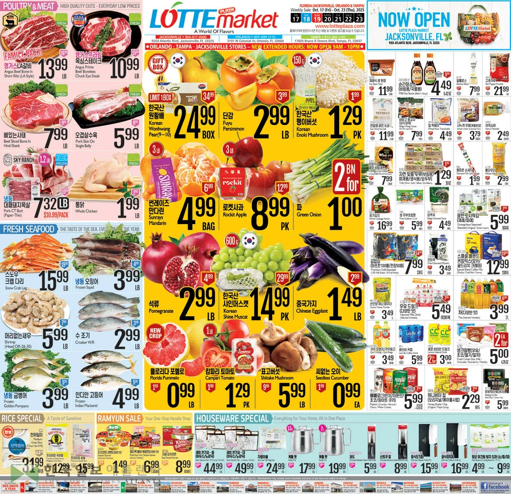 프로듀스 코너에서는 한국산 원황배 BOX 24.99, 단감 LB 2.99, 한국산 팽이버섯 PK 1.29, 썬레이즈 만다린 BAG 4.99, 로켓사과 PK 8.99, 파 2BN FOR 1.00, 석류 LB 2.99, 한국산 샤인머스켓 PK 14.99, 중국가지 LB 1.49, 폴로리다 포멜로 LB 0.99, 캄파리 토마토 PK 1.29, 표고버섯 LB 5.99, 씨없는 오이 EA 0.99에 선보인다.
