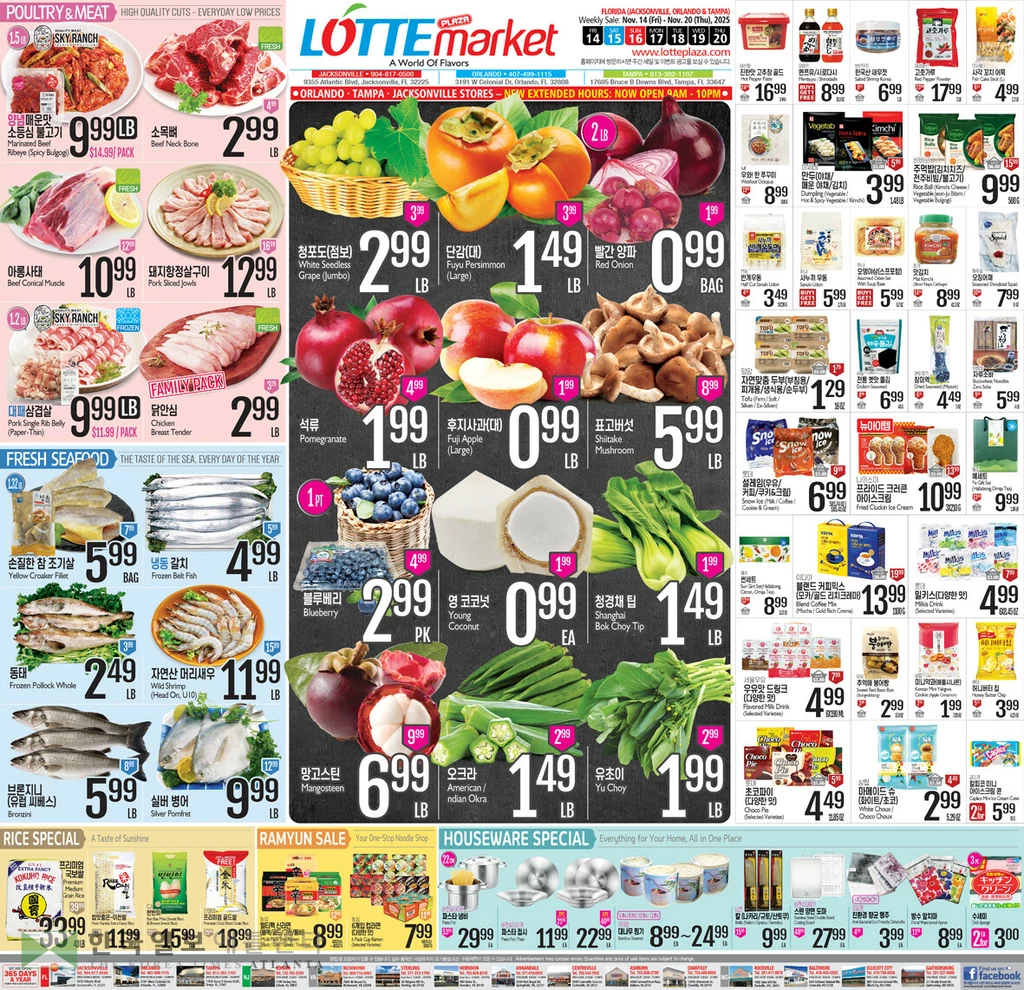 프로듀스 코너에서는 청포도(점보) LB 2.99, 단감(대) LB 1.49, 빨간양파 BAG 0.99, 석류 LB 1.99, 후지사과(대) LB 0.99, 표고버섯 LB 5.99, 블루베리 PK 2.99, 영 코코넛 EA 0.99, 청경채 팁 LB 1.49, 망고스틴 LB 6.99, 오크라 LB 1.49, 유초이 LB 1.99에 판매된다.