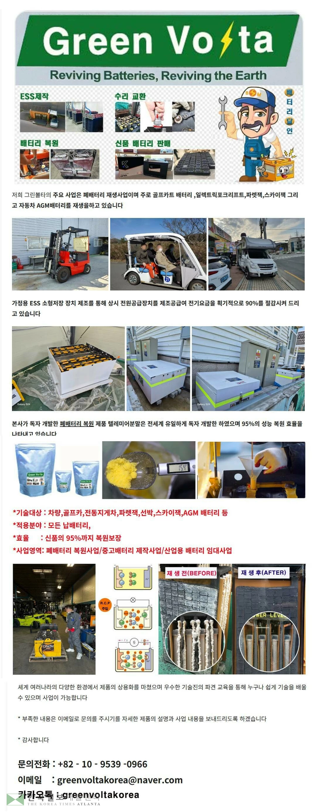 저희 그린볼타의 주요 사업은 폐배터리 복원사업이며 주로 골프카트 배터리 ,일렉트릭포크리프트,파렛잭,스카이잭 그리고 자동차 AGM배터리를 복원을 하고 있습니다