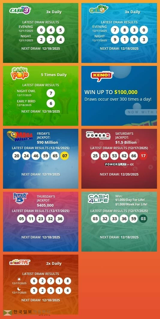 수요일 파워볼 추첨에서 잭팟 당첨자는 나오지 않았으나, 잭팟 금액이 15억 달러로 치솟아 역대급 규모를 기록했다. 조지아주에서는 4개의 화이트볼과 파워볼을 맞춘 두 장의 티켓이 각각 5만 달러와 20만 달러의 당첨금을 받게 됐다. 다음 파워볼 추첨은 12월 21일 토요일에 진행될 예정이다.