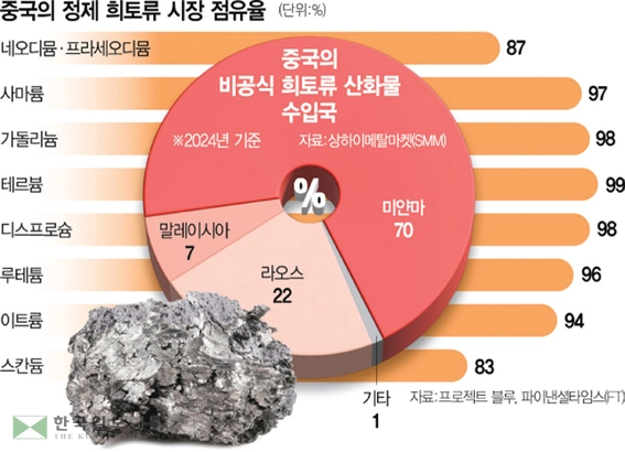 중국이 희토류 수출통제를 강화하며 세계 산업계의 ‘목줄’을 쥐고 있지만 중국의 희토류 패권이 외부 변수에 흔들릴 수 있다는 분석도 제기된다. 중국이 희토류 정제 능력의 90%를 보유하고 있지만 원료의 상당량은 해외에 의존하고 있어서다. 특히 미얀마는 최대 공급처로, 지난해 중국은 전체 희토류 수입량의 57%인 4만 4000톤을 미얀마에서 들여왔다. 상하이메탈마켓(SMM)은 비공식 루트를 통해 유입되는 중희토류 산화물의 약 70%가 미얀마산이라고 추정한다.