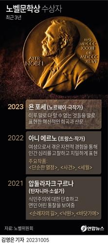 2023년 노벨 문학상 수상자로 노르웨이의 극작가이자 소설가·시인인 욘 포세(64)가 선정됐다.