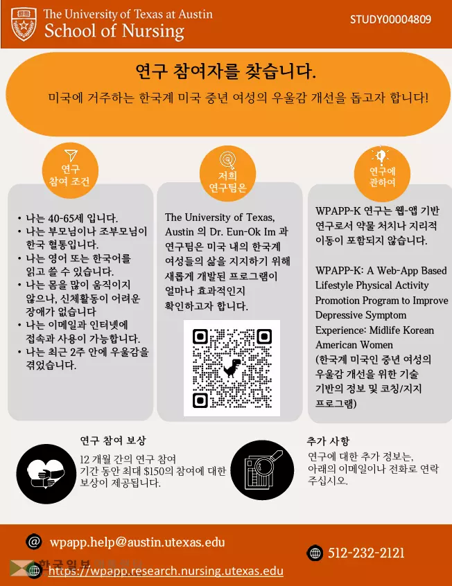 저희는 현재 미국에 거주하는 중년 한인 여성들을 대상으로 우울감을 개선하기 위한 웹/앱 기반 생활 습관 신체 활동 증진 프로그램에 대한 연구를 진행중에 있습니다. 저희는 본 연구에 참여하실 분을 모집하고 있습니다. 1) 40세에서 65세의 한국계 미국 거주 여성으로서 2) 부모님이나 조부모님이 한국인이며 3) 몸을 많이 움직이지 않으나, 신체 활동이 어려운 장애 없으며 4) 영어 또는 한국어를 읽고 쓸 수 있고 5) 인터넷에 접속이 가능하며 6) 최근 2주 안에 우울감을 경험한 분을 저희 연구의 참여자로 모십니다.