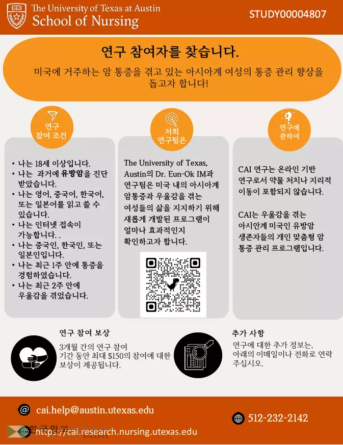 저희는 최근 미국에 거주하며 유방암을 진단받은 아시아 여성들을 대상으로 기술 기반의 정보 및 코칭/지지 프로그램 효과를 확인하는 연구를 진행 중에 있습니다. 이 연구는 미 국립보건원으로부터 연구비 지원을 받고 있습니다. 저희는 본 연구에 참여하실 분을 모집하고 있습니다. 1) 18 세 혹은 그 이상의 아시아계 미국 거주 여성으로서 2) 최근 5년 내에 유방암을 진단받았으며 3) 영어, 만다린어, 한국어, 혹은 일본어를 읽고 쓸 수 있고 4) 인터넷에 접속이 가능하며 5) 세부인종이 중국인, 한국인, 혹은 일본인인 분을 저희 연구의 참여자로 모십니다.