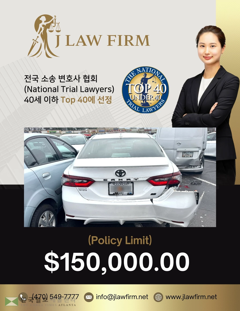 J LAW FIRM / 주차장 교통사고 보상금 전액 한도 $150,000 승소! / 교통사고 및 개인상해 전문 로펌