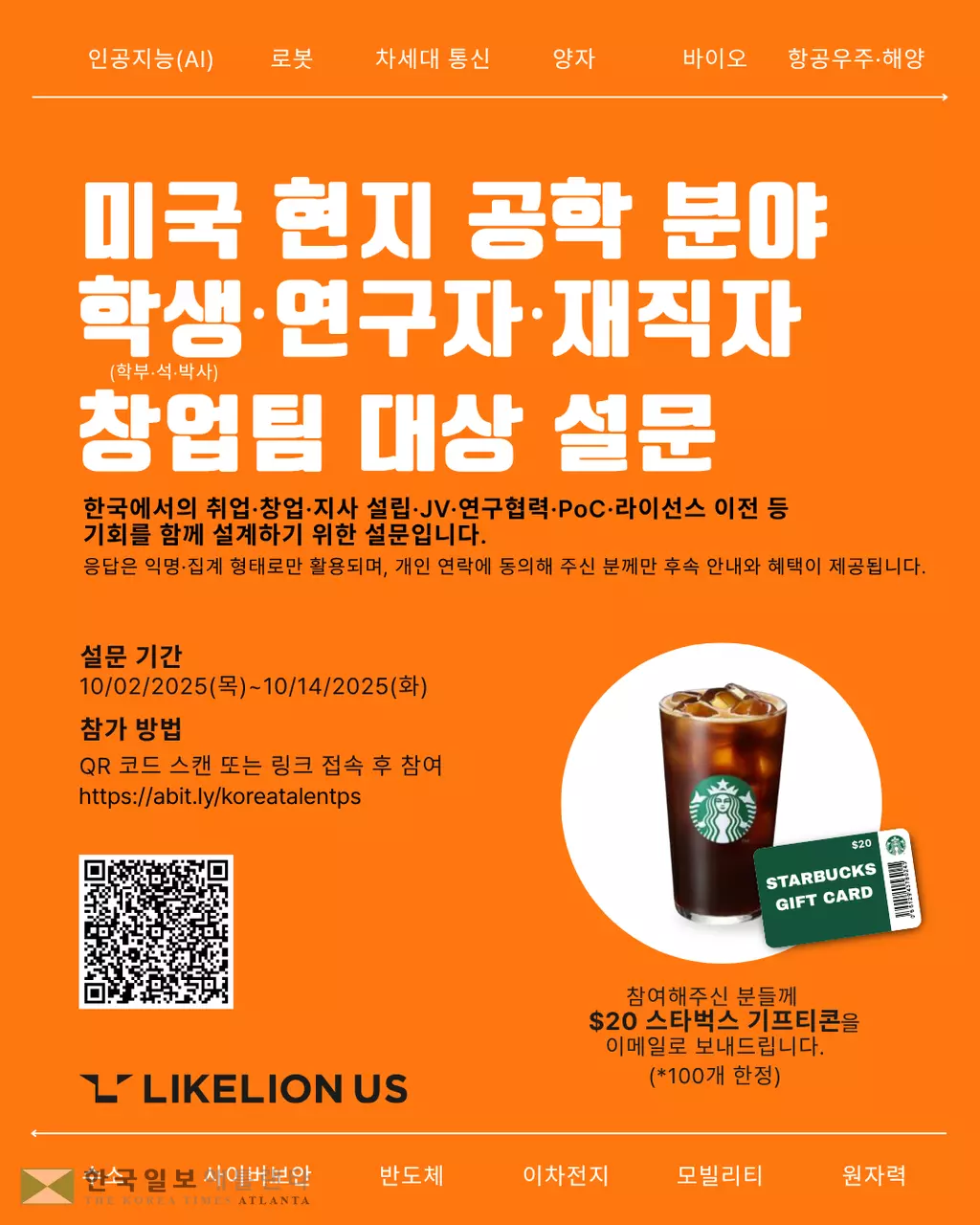 [$20 스벅쿠폰] 미국에서 공학 분야 학부생, 석·박사생, 박사후연구원(포닥),재직자, 창업팀 대상 설문조사