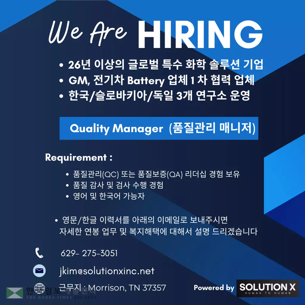 | [ 구인·구직 ]글로벌 특수 화학 솔루션 기업 (품질 관리 매니져) | 38 | Hannah Kim | 2025-12-15 |