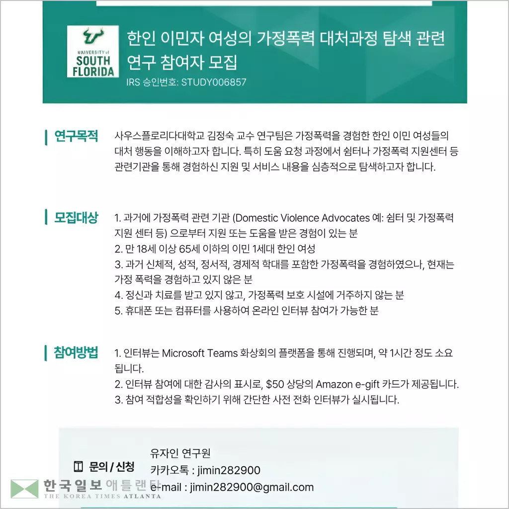 사우스플로리다대학교(University of South Florida) 연구팀에서는 가정 위기 상황을 경험한 한인 이민 여성들의 대처 과정과 지원기관 이용 경험을 이해하기 위한 연구를 진행하고 있습니다.