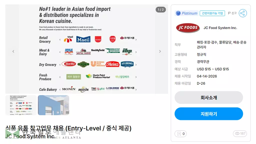 조지아 창고 업무 2명 긴급 모집 (Entry-Level / 점심 제공)