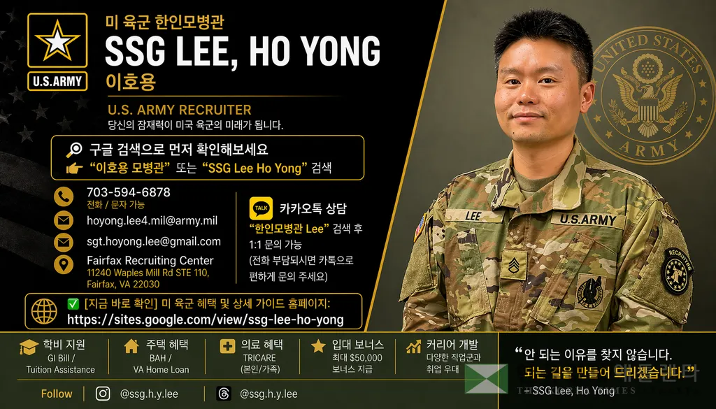 "미군 육군 한인 모병관이 직접 캘리포니아에서 뉴욕까지, 미국 어디에 계시든 미군 입대에 관한 가장 정확한 정보를 드립니다."