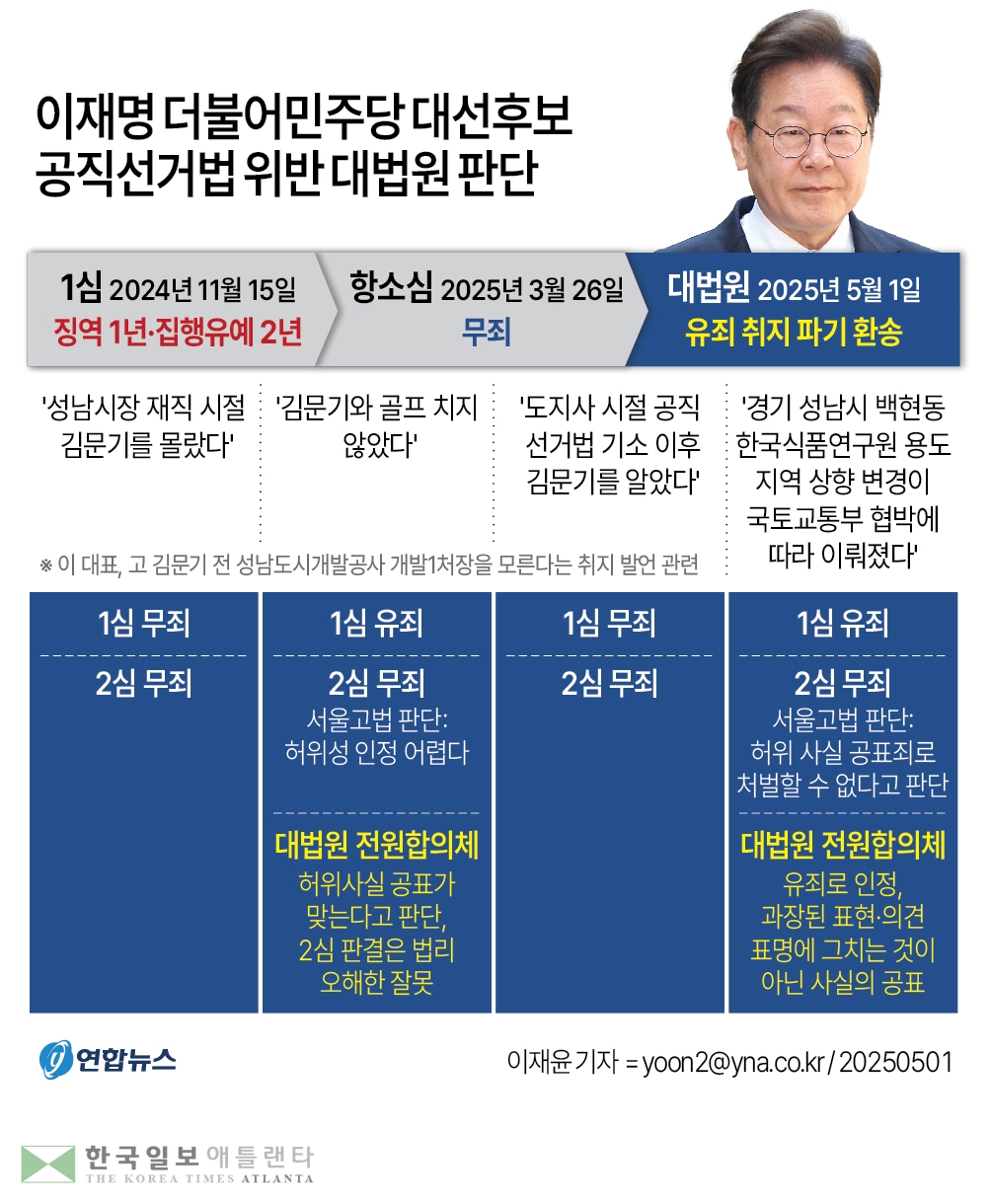 대법원 전원합의체(주심 박영재 대법관)는 1일 이 후보에게 무죄를 선고한 원심판결을 파기하고 사건을 서울고법으로 돌려보냈다. 재판장은 조희대 대법원장이다.