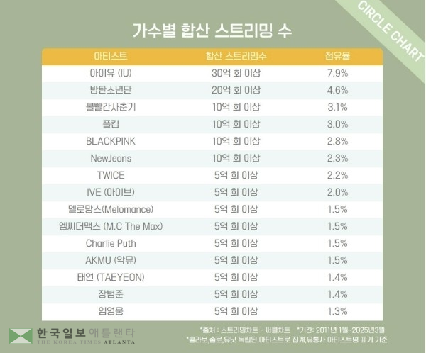 2011∼2025년 써클차트 분석…2위는 20억회 넘긴 방탄소년단