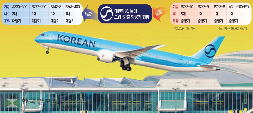 17일 항공업계에 따르면 대한항공은 올 들어 A330-300, B777-200, B747-8 등 대형항공기 8대를 퇴출하고 B787-10, A321-200네오(neo) 등 중형 항공기 8대를 도입하며 기단을 최신화하는데 박차를 가하고 있다. 업계 관계자는 “B787 모델 등 중형기를 중심으로 올해 항공기 23대를 확보할 예정”이라고 말했다.