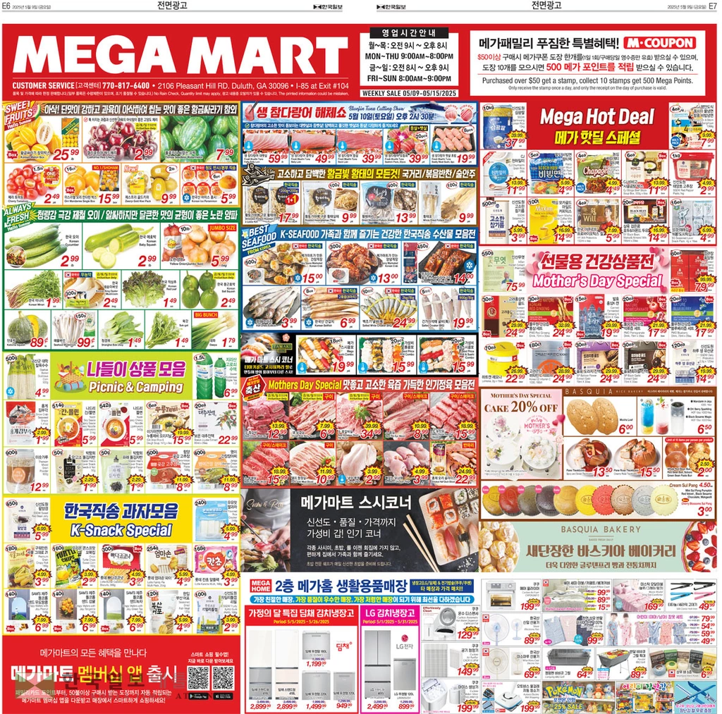 마더스데이 스페셜로LA갈비(패밀리팩) LB 10.99, 냉동삼겹살(패밀리팩) LB 4.49, 찜갈비LB 10.99, 갈비선물세트 149.99, 바다장어(1KG) SET 39.99, 활(活 )광어LB 28.99, 모듬회스페셜PK 42.99, 골든키위BOX 30.99, 이스라엘 만다린(22 LB ) BOX 39.99, 즉석 6년근 고려홍삼 BOX 259.99 등이 선보인다.