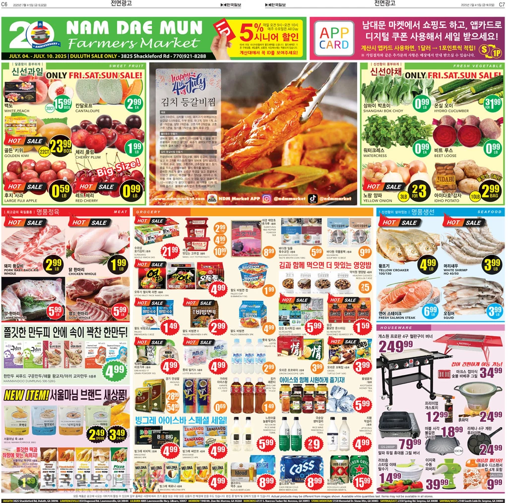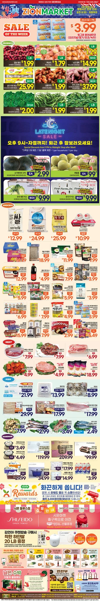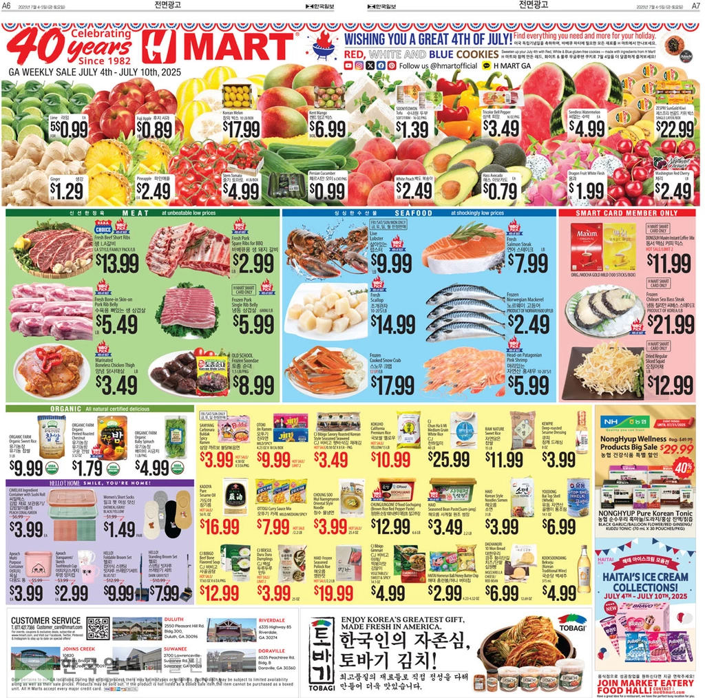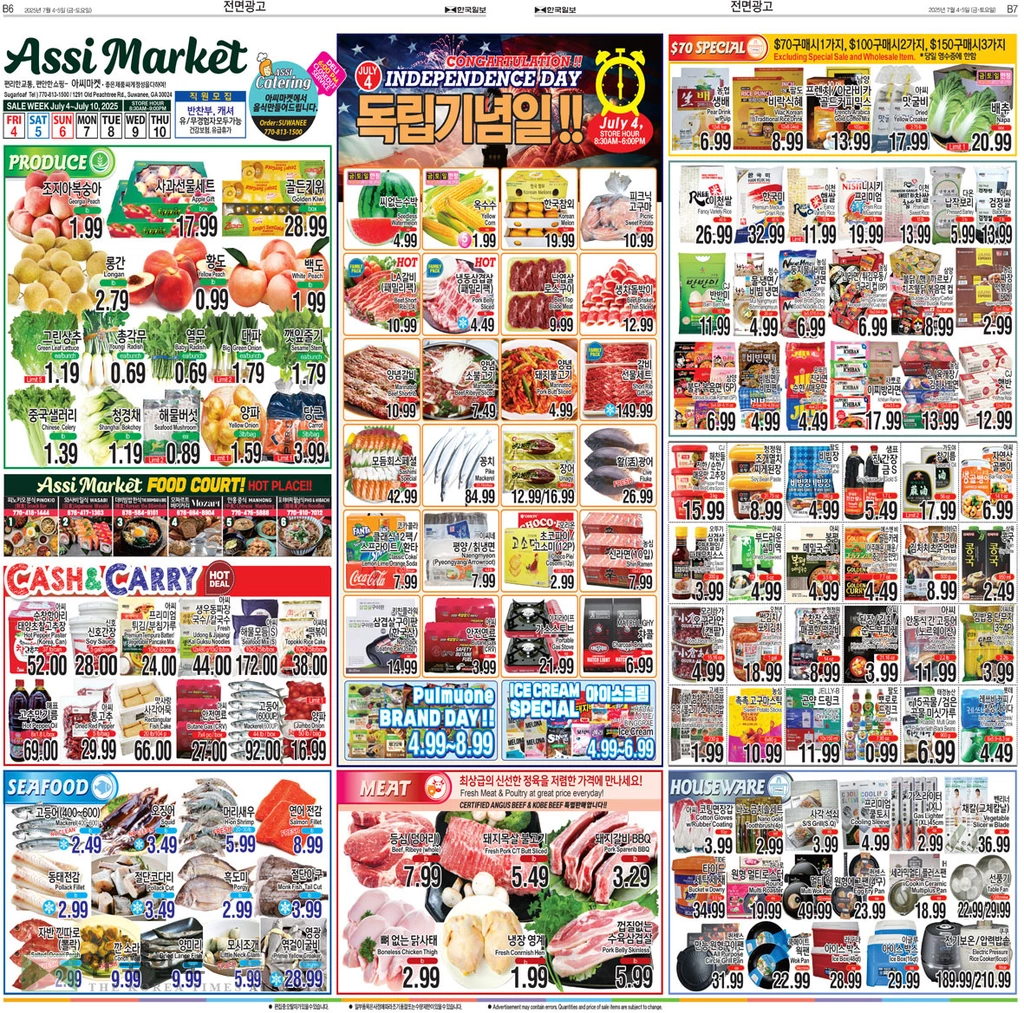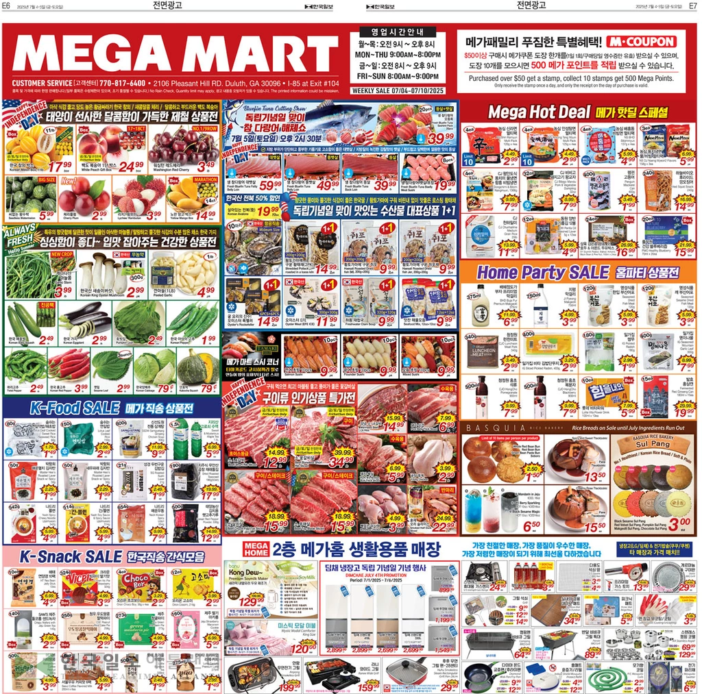 이번주 메인품목으로는 씨 없는 수박EA 4.99,옥수수EA/5FOR. 1.99, 한국참외(BOX) EA 19.99, 피크닉 고구마(10LB,BAG)EA 10.99, LA갈비(패밀리팩)LB 10.99, 냉동삼겹살(패밀리팩) LB 4.49, 생 차돌박이LB 12.99, 낙엽살 로스구이LB 9.99, 양념 갈비LB 10.99, 양념소불고기 LB 7.49,양념돼지불고기LB 4.99, 갈비선물세트 LB 149.99, 코카콜라 클래식 12팩 7.99, 오리온 초코파이16.5OZ 2.99, 고소미 (12P) 2.99, 이씨네 평양 냉면 4.4 LB 7.99, 칡 냉면 4.4 LB 7.99, 농심 신라면(10입) 7.99,모듬회스페셜PACK 42.99, 활(活)광어LB 26.99, 장어 (14 OZ)16.99, 꽁치(21.70 OZ,BOX)EA 84.99, 아씨 코팅면장갑10PR 3.99, 아씨 안전연료EA 4.49 등이 선보인다.