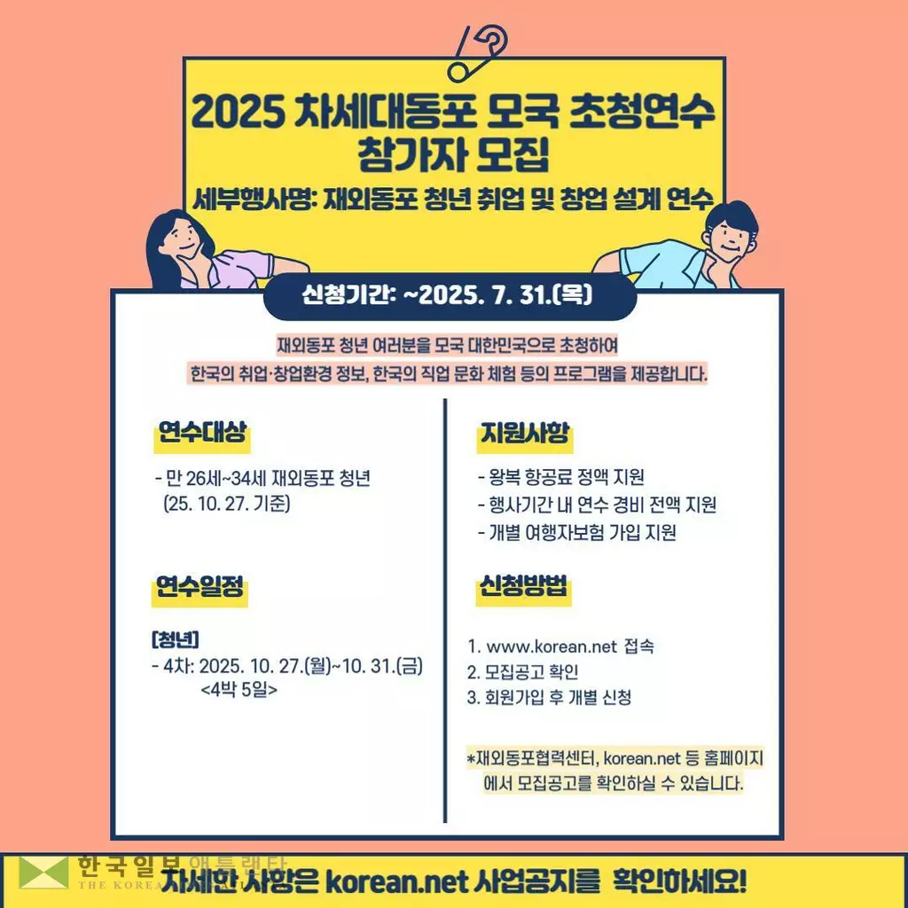 재외동포협력센터는 전 세계 재외동포 청년 대상 한국의 취업 및 창업 환경 소개, 역사 사회 등 체험 기회를 제공하여 한인 정체성 함양 및 자긍심 고취를 위해 「2025년 차세대동포 모국 초청연수(청년 4차)」 참가자를 모집하고 있다.