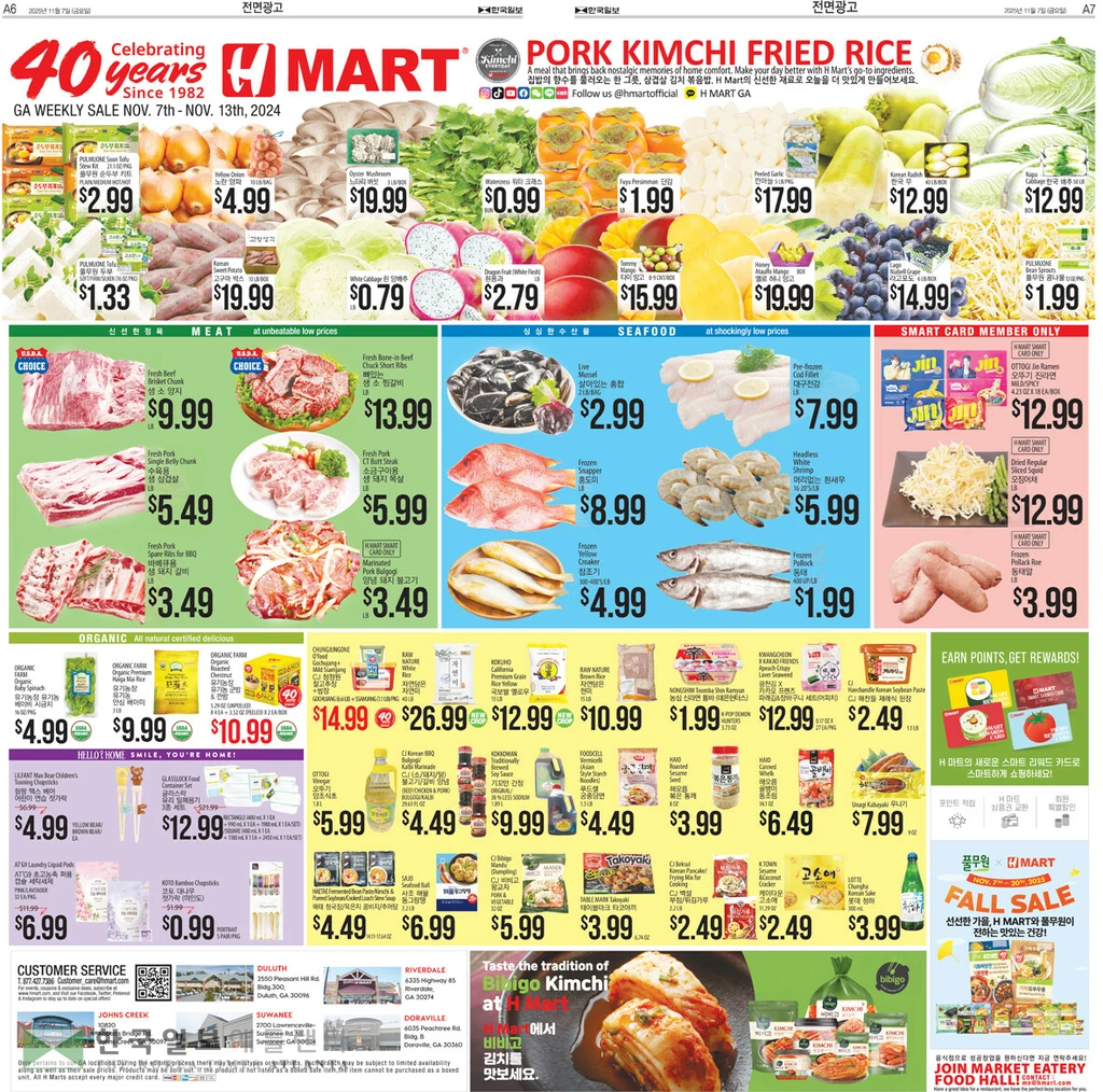 그로서리 코너에서는 자연담은 자연미 40LB EA 26.99,국보쌀 옐로우 15LB EA 12.99, 자연담은 현미 15LB EA 10.99, 해오름 볶은통깨 8OZ EA 3.99, 농심 신라면 툼바 컵 (데몬헌터스) 3.73 OZ (106G) EA 1.99, 푸드셀 궁중당면 1.5LB EA 4.49, CJ 백설 튀김가루 2.2LB(1KG) EA 2.49, 청정원 찰고추장+쌈장 (Hmart 40주년 기획) 500g EA 14.99, CJ 해찬들 재래식 된장 1.1LB(500G) EA 2.49, 기꼬만 저염 간장(2qt) 64OZ(1.89L) EA 9.99에 공급된다.