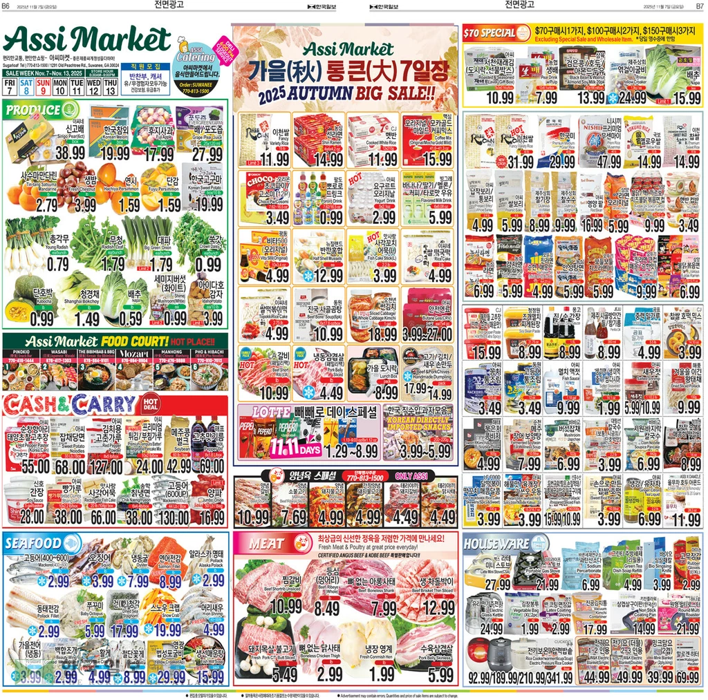 생선 코너에서는 물 오징어 (600/800) LB 3.79, 노르웨이 고등어 (400/600 )LB 2.79, 뉴질랜드 반깐홍합 (2 LBS)BOX 15.99 - 9.99, 홍창 백합조개 (1 LB)PK 2.99 - 1.99, 자연나라 홍합탕 (500 G) PK 5.99 - 4.99, 시메사바 (25 G) PK 5.99 - 2.99, 튀김새우 (16-20) BOX 17.99 - 12.99, 깐새우 (51-60) 2LB PK 17.99 - 9.99, 한국 새우젓LB 8.99 - 5.99, 연어 뱃살 LB 5.99 - 3.99에 공급된다.