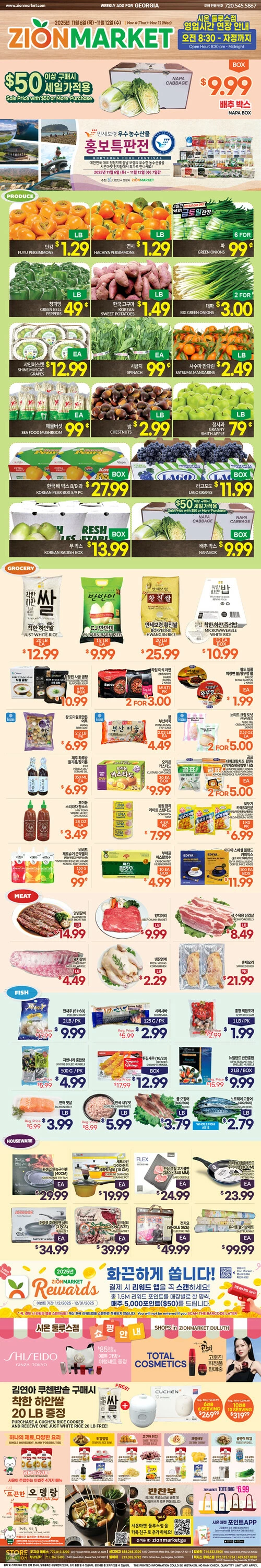 과일 코너에서는 (금/토/일 한정) 단감 파운드 1.79,한국산 캠벨포도 박스 19.99,잎달린 만다린 팩 9.99,석류 ea 2.49,생밤 파운드 $2.99,연시감 선물 박스 \- 29.99,한국산 천안배 9과/ 10 과 박스 $29.99에 판매된다.
