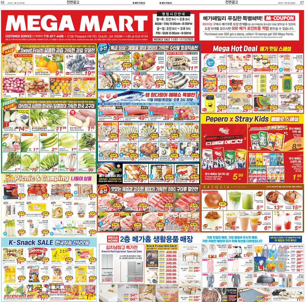 해산물 코너에서는 머리없는 새우 31/35 LB 4.99, 쭈꾸미 16/25 PK 9.99, 금병어 600/800(NO CLEAN) LB 3.99, 바지락 조개살 200/300 PK 5.99, 남대문 틸라피아 필렛 3-5, 2LB/PK2LB/PK 5.99, 연어스테이크LB 6.99에 공급된다.