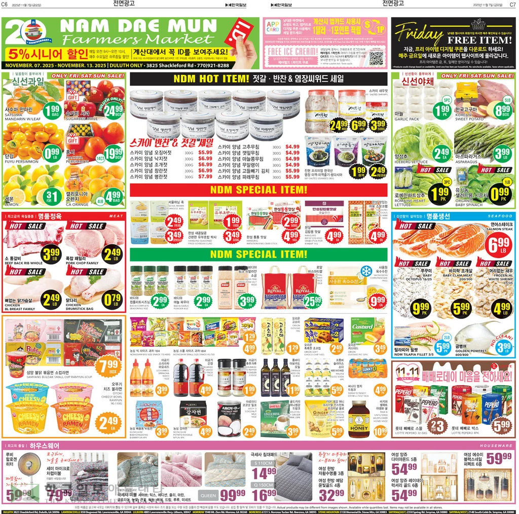 이번 주 메인상품으로는 이천 쌀 (OLD) 15 LB 11.99, 농심 신라면(4PX4) BOX 14.99, CJ햇반 12X210G 11.99, 맥심 모카골드 마일드 커피믹스 (100포) 15.99, 아씨 굵은 바다 소금 10 LB 5.99 등이 선보인다.