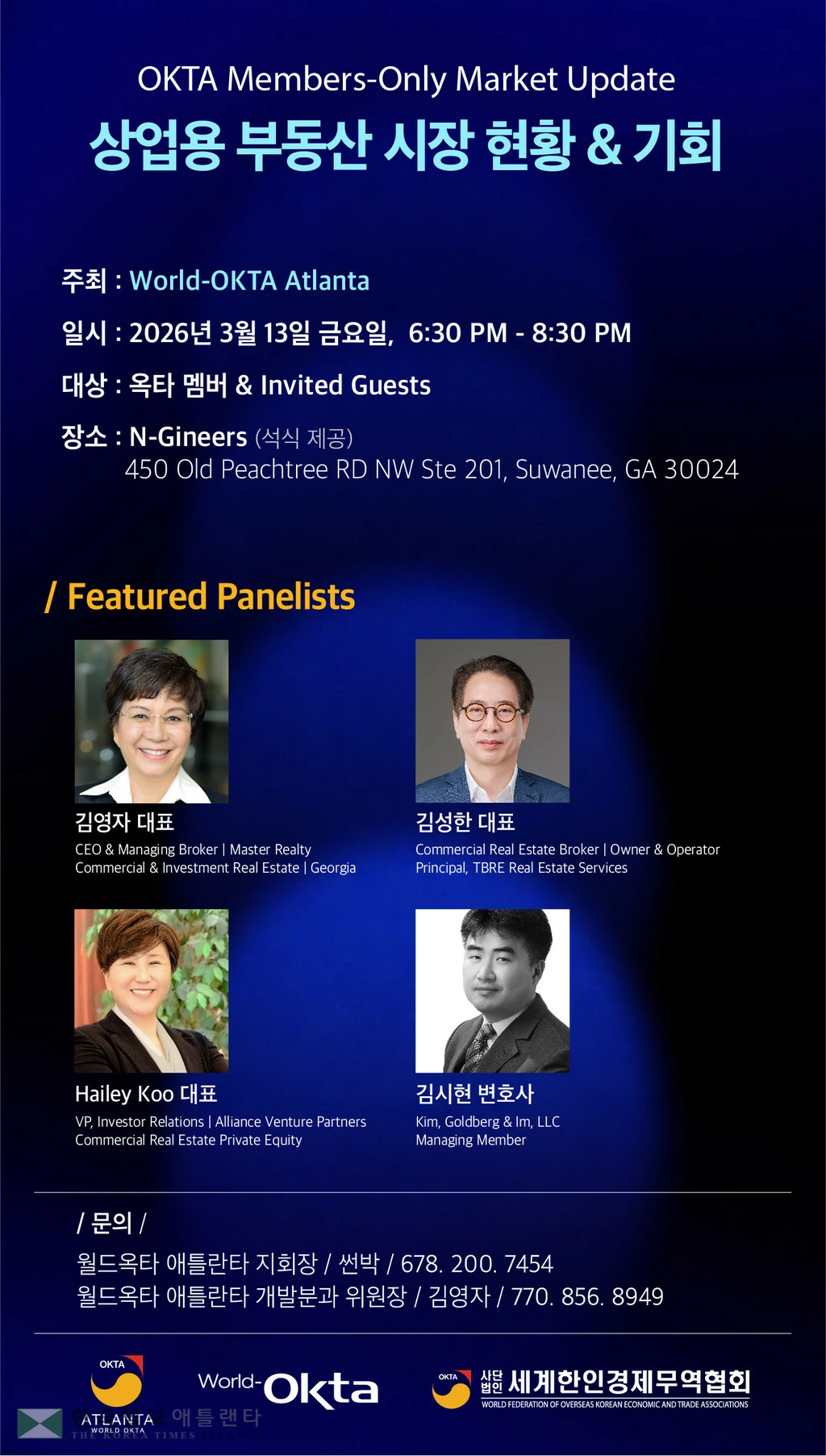 옥타 회원 및 초청 인사들을 대상으로 하는 이번 세미나에서는 마스터 리얼티 김영자 대표, 커머셜 전문 TBRE 부동산 김성한 대표, 헤일리 구 부동산 전문인, 김시현 변호사가 패널로 나서 부동산 시장 현황 및 투자에 관해 조언한다.