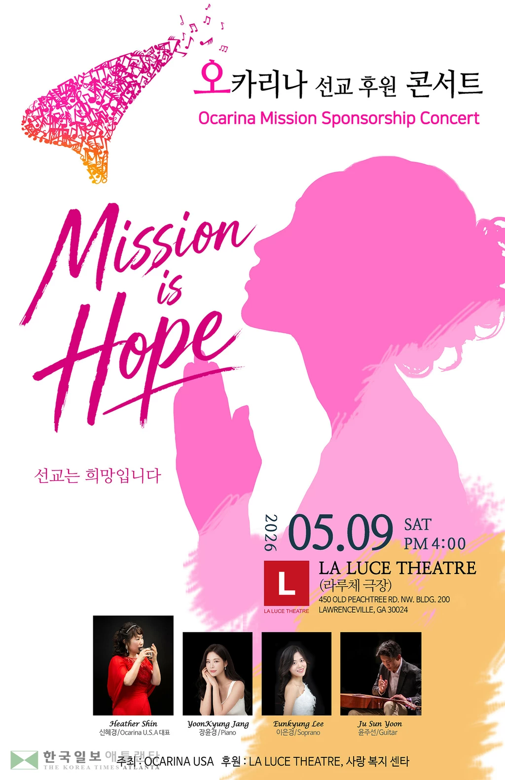 오카리나 USA(대표 신혜경)는 오는 5월 9일(토) 오후 4시, 조지아주 스와니에 위치한 라루체 극장에서 ‘오카리나 선교 후원 콘서트: Mission is Hope’를 개최한다.