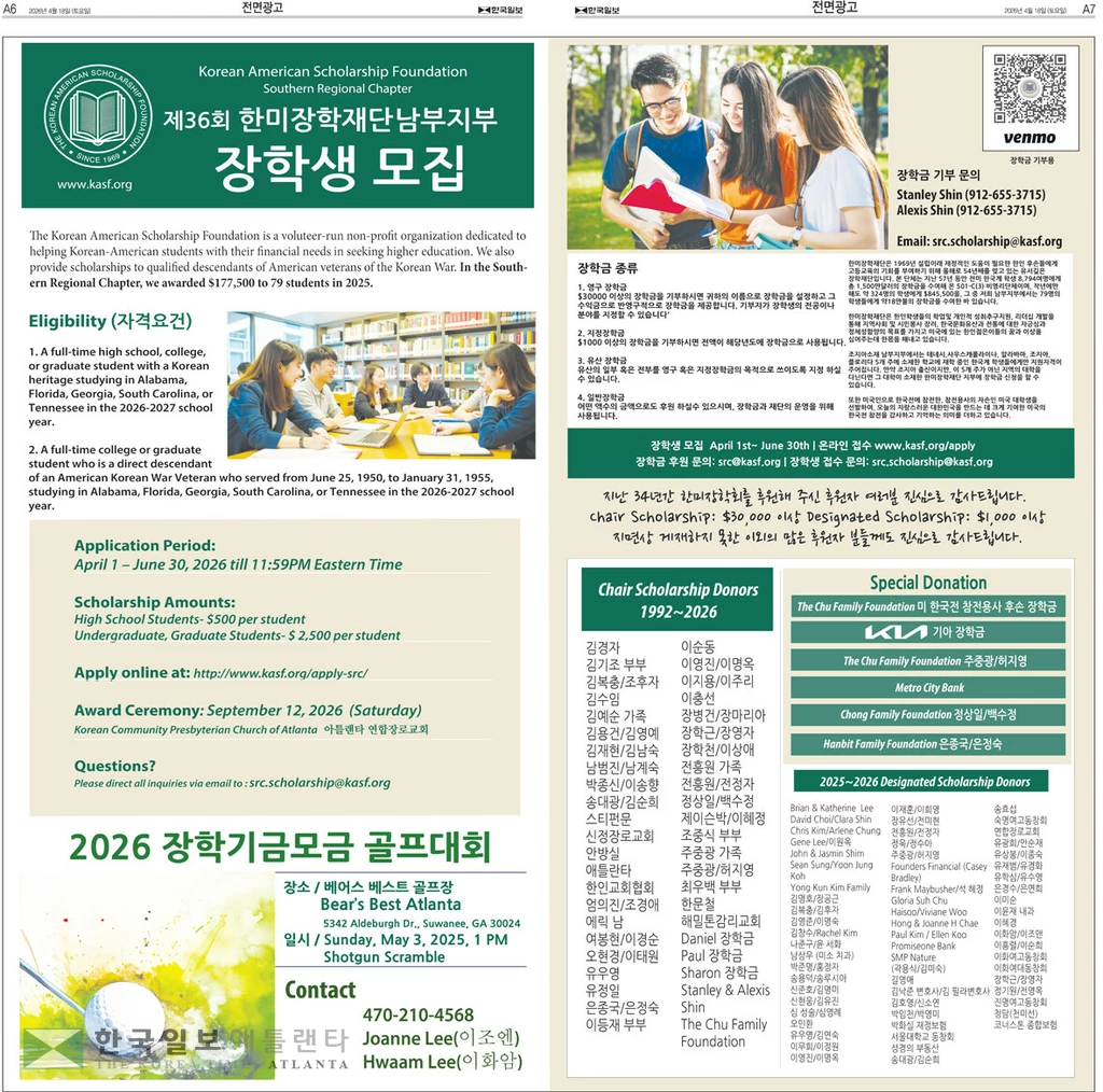 조지아, 앨라배마, 플로리다, 테네시, 사우스 캐롤라이나 대학에 재학중인 학부, 대학원생으로 6월 30일까지 신청 접수를 받는다. 온라인 www.kasf.org/apply로 접수하며, 문의는 src.scholarship@kasf.org로 하면 된다.