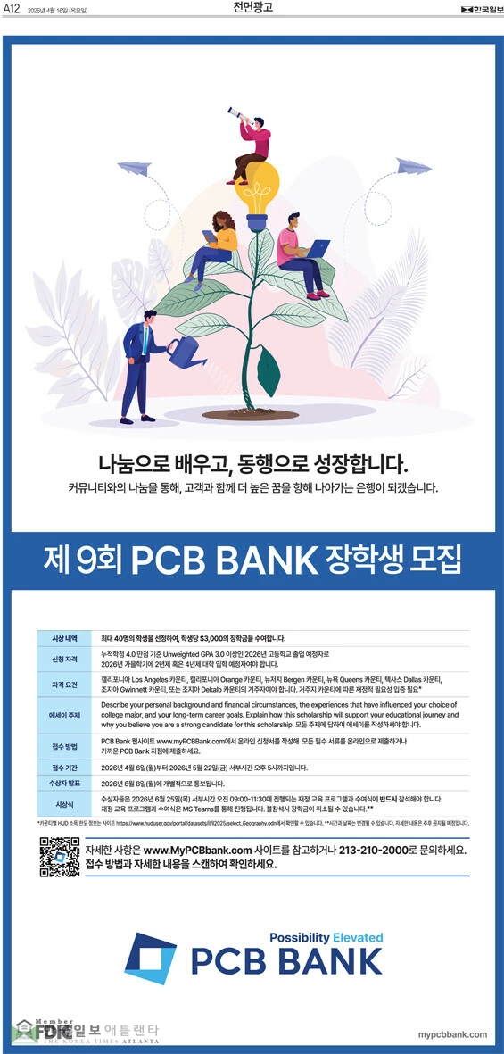40명을 선발해 3,000달러씩 장학금을 수여한다. GPA 3.0 이상의 고교 졸업 예정자로 대학에 가을학기 입학해야 한다. 조지아주는 귀넷, 디캡카운티 거주자여야 한다. 5월 22일 접수마감. 자세한 내용은 www.myPCBBank.com에서 확인할 수 있다.