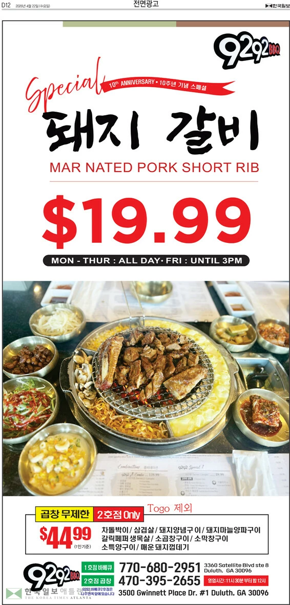 10주년 기념 스페셜로 돼지갈비 1인분 19.99달러 월-목 올데이 금 3시까지 스페셜로 제공하며 2호점에서는 곱창 1인분 44.99달러 무제한에 제공한다. 문의. 470-395-2655