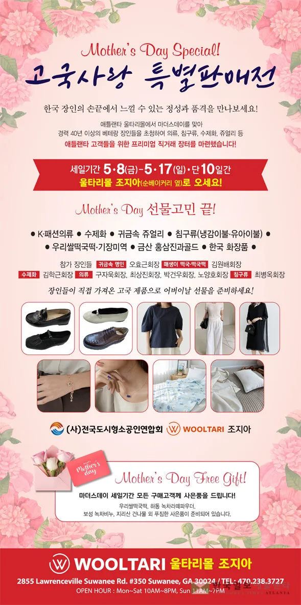애틀랜타 울타리몰은 5월 8일-17일 마더스 데이 스페셜로 '고국사랑 특별판매전'을 실시한다. 한국 장인들이 직접 만든 K패션의류, 수제화, 쥬얼리, 침구류, 미역, 화장품 등을 판매한다. 장인들이 직접 가져온 고국 제품으로 어버이날 선물을 할 수 있다. 세일기간 모든 구매 고객에게 사은품을 증정한다. 문의=470-238-3727.