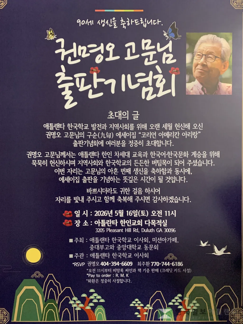 애틀랜타 한국학교 권명오 고문의 90세 생신과 에세이집 '코리언 아메리칸 아리랑' 출판기념회가 5월 16일 오전 11시 아틀란타 한인교회 다목적실에서 열린다. 문의=권명오 404-394-6609, 최주환 770-744-6186.