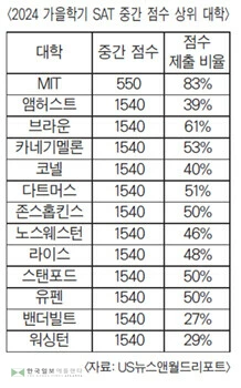 점수 제출 여부가 고민이라면 관심 있는 대학 입학처에 직접 연락해 ‘이 점수를 제출하는 것이 좋겠느냐’라고 문의하는 것도 좋은 방법이다. 또 장학금 수혜가 목표인 지원자는 해당 학교의 최소 시험 점수 요건을 확인하고 해당되면 점수를 제출하는 것이 좋다. 다음은 2024년 가을 신입생을 대상으로 한 수학 및 독해 합산 중간 점수 상위권 대학이다. (도표: SAT 중간 점수 상위권 대학)