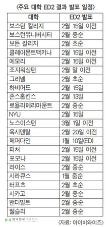 ED는 EA, 정시 지원, 롤링 어드미션 등 다른 입학 전형과 달리 법적 구속력은 없지만, 합격할 경우 해당 대학에 반드시 등록해야 하는 전형이다. 대부분의 ED 마감일은 11월이며, 일부 대학은 10월 중순으로 더 이른 경우도 있다. 반면 다른 전형들은 보통 12월부터 2월 사이에 원서 접수가 마감된다. 롤링 어드미션의 경우 봄까지, 늦게는 학기 개강 직전 주까지도 지원이 가능하다.