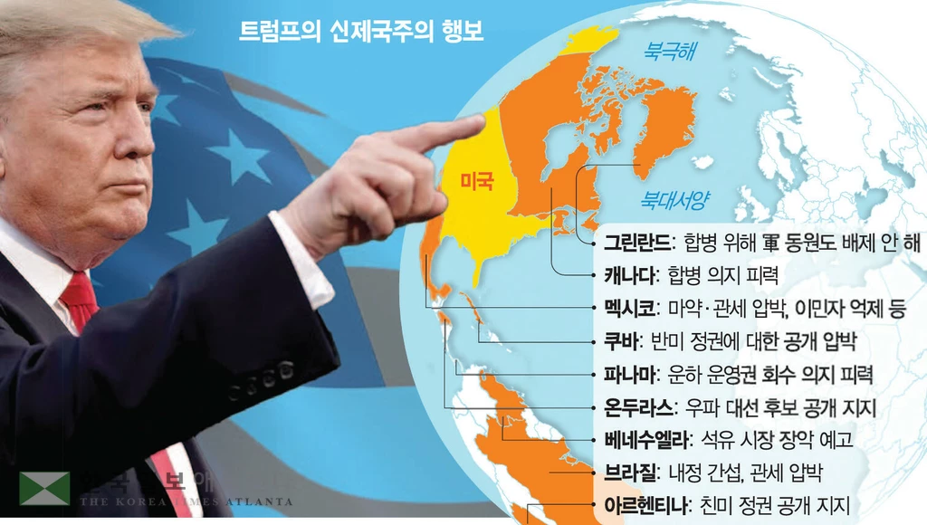 백악관이 덴마크령인 그린란드를 차지하기 위해 군 동원도 배제하지 않고 있다고 밝혀 논란이 일고 있다. 도널드 트럼프 대통령이 월등한 군사·경제력을 바탕으로 서반구(아메리카 대륙)를 사실상 지배하려는 ‘신제국주의’ 행보를 노골화하고 있다는 지적이 나온다.