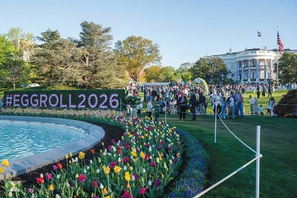 부활절을 기념해 대통령 부부가 참석한 가운데 열리는 백악관 부활절 달걀 굴리기 행사가 6일 백악관 사우스론에서 펼쳐졌다. 이날 행사에는 도널드 트럼프 대통령과 부인 멜라이나 여사가 나와 많은 어린이들이 참석한 부활절 전통 행사를 이끌었다. 이날 백악관 남쪽 정원에 2026년 부활절 달걀 굴리기 행사를 알리는 대형 배너가 설치돼 있다. [로이터]