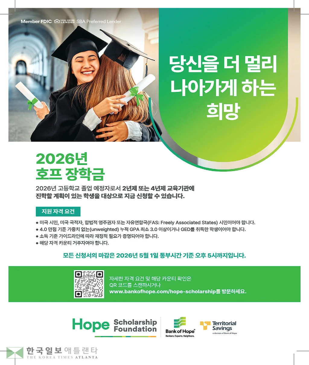 미주 최대 한인은행인 뱅크오브호프(행장 케빈 김ㆍ사진)의 ‘호프 장학재단’이 2026년 ‘호프 장학금’ 신청자를 모집한다.