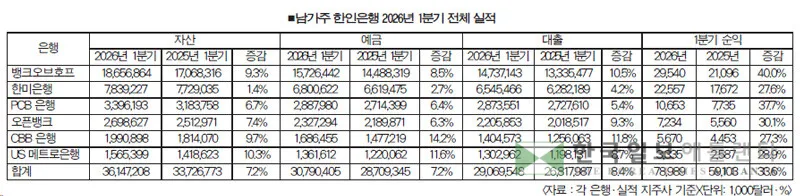 뱅크오브호프, 한미은행, PCB 은행, 오픈뱅크, CBB 은행, US 메트로 은행 등 6개 한인은행들의 2026년 1분기 실적을 집계한 결과, 이들 은행의 1분기 순익은 총 7,899만달러를 기록했다. 이는 전년 동기인 2025년 1분기 5,910만달러 대비 33.6%나 증가한 것이다.