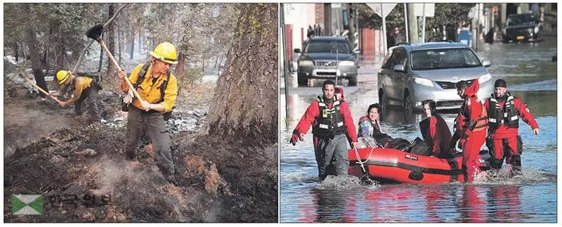 서부는 산불, 동부는 홍수로 마을 곳곳이 초토화되면서 미국이 양 극단의 기후 재난을 보이고 있다. 건조한 기후로 캘리포니아에서 네바다주까지 무섭게 확산되던 캘도로 산불은 지난 2일 강풍이 잦아들면서 일단 위기는 모면했으나 주민들은 여전히 대피한 상태다. 뉴욕과 뉴저지주는 북동부를 휩쓴 허리케인 아이다의 영향으로 물폭탄이 떨어지듯 폭우가 내려 3일 현재 사망자수가 최소 46명으로 늘어났다. 캘도르 산불이 지나간 사우스 레익타호에서 화재 진압 현장을 수습 중인 소방관들(왼쪽)과 기록적인 폭우 피해를 입은 뉴욕주 마마로넥의 거리에서 보트로 인명 구조를 하는 구조대원들의 모습이 숙연함을 느끼게 한다. [로이터=사진제공]