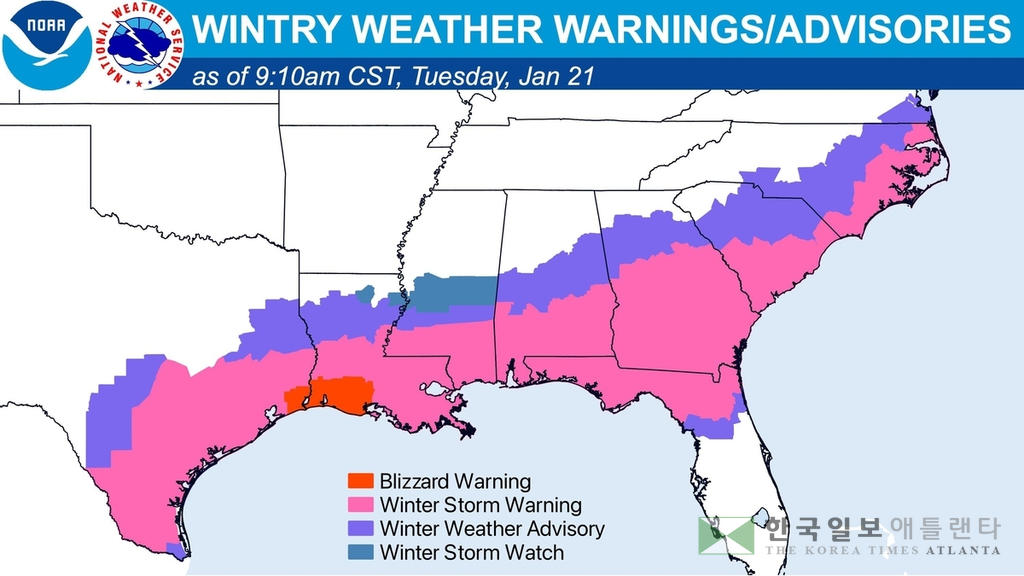 미 기상청(NWS)은 21일 텍사스 동남부인 휴스턴에서 플로리다 서부, 조지아주 남동부에 이르는 멕시코만 연안 지역에 겨울 폭풍 경보를 일제히 발령했다.