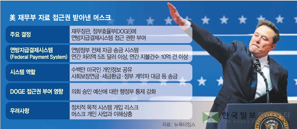 뉴욕타임스(NYT)는 1일 익명의 소식통을 인용해 스콧 베센트 재무장관이 지난달 31일 DOGE에 연방정부 지급결제 시스템에 접근할 수 있는 권한을 부여했다고 보도했다. 트럼프 대통령의 지시로 설립된 DOGE는 공식 정부 부처는 아니지만 연방정부 지출 감축과 관료제 효율화를 목표로 하는 행정부 내 특별팀이며 머스크가 수장을 맡고 있다.