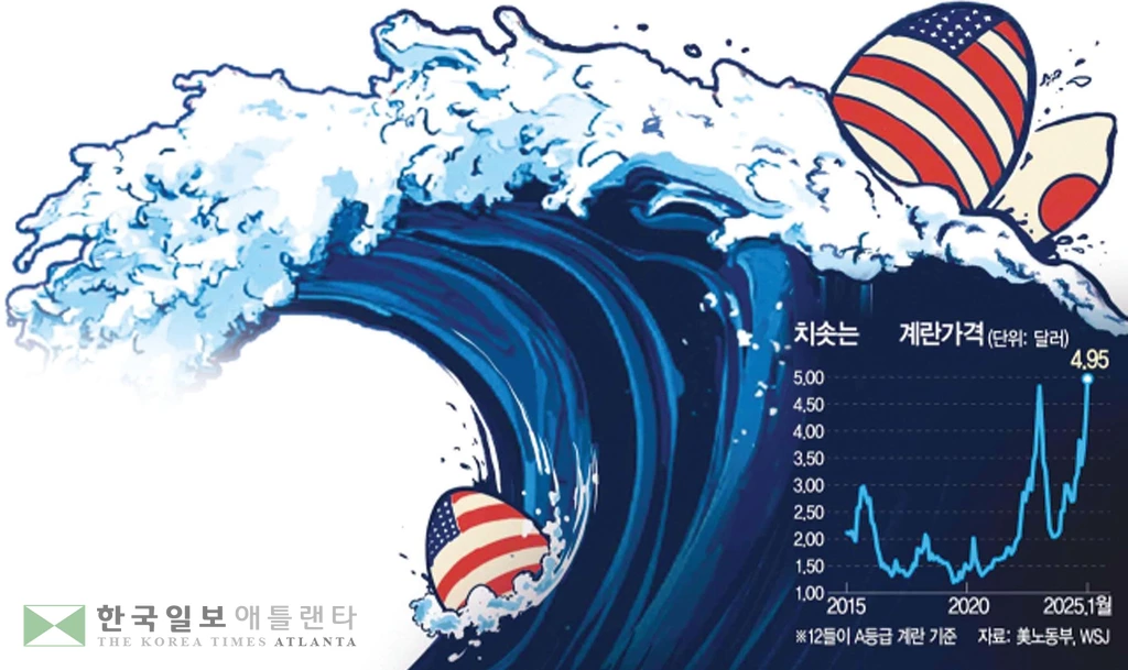 미국의 대표적인 소매점 중 하나인 트레이더조에서는 최근 고객 한 명이 구매할 수 있는 계란의 개수를 12개로 제한하고 있다. 지난해 말부터 계란 진열대가 텅 비면서 나온 조치다. 월스트리트저널(WSJ)에 따르면 12개들이 A등급 계란의 평균 가격은 지난달 4.95달러로 사상 최고치를 경신했다. 2022년까지만 해도 대부분 1달러대였다. 계란 대란은 미국이 겪고 있는 물가 대란의 상징적인 장면이다. 실제로 1월 소비자물가지수(CPI)에서 식품 비용 상승률은 전월 0.3%에서 0.5%로 커졌다. 예상 외로 고물가 흐름이 강해지자 미 연방준비제도(Fed·연준)의 통화정책 스텝이 꼬이는 분위기다.