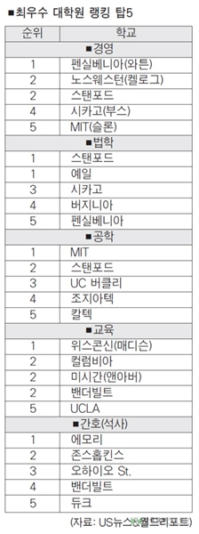 또 교육대학원 순위에서는 위스콘신(매디슨), 컬럼비아, 미시간(앤아버), 밴더빌트, UCLA 순으로 탑5를 형성했고, 간호대학원(석사) 프로그램의 경우 에모리에 이어 존스홉킨스, 오하이오 스테이트, 밴더빌트, 듀크대 순으로 5위까지 이름을 올렸다.