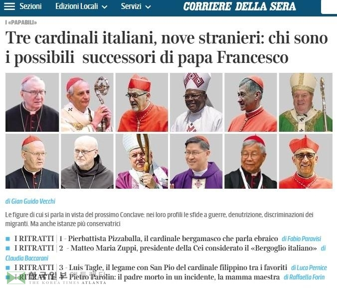 코리에레델라세라는 프란치스코 교황의 후임자를 뽑는 콘클라베(Conclave·교황 선출을 위한 추기경단 비밀회의)를 앞두고 22일(현지시간) 총 12명의 차기 교황 유력 후보를 선정했다.