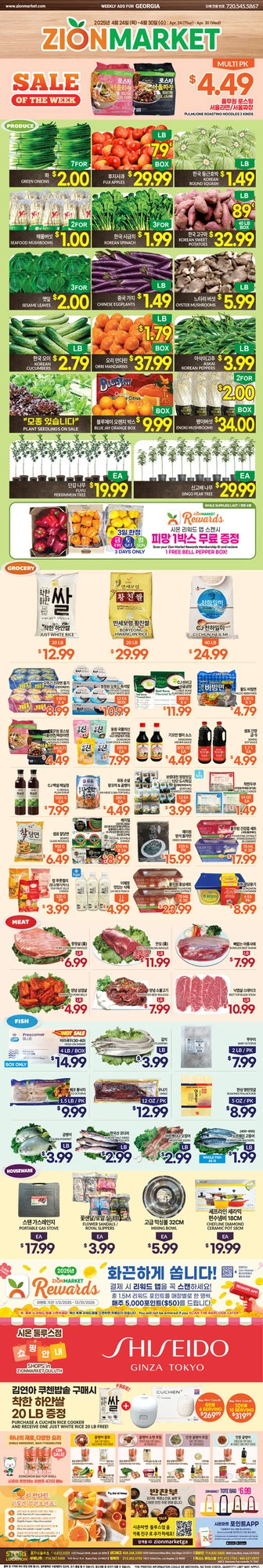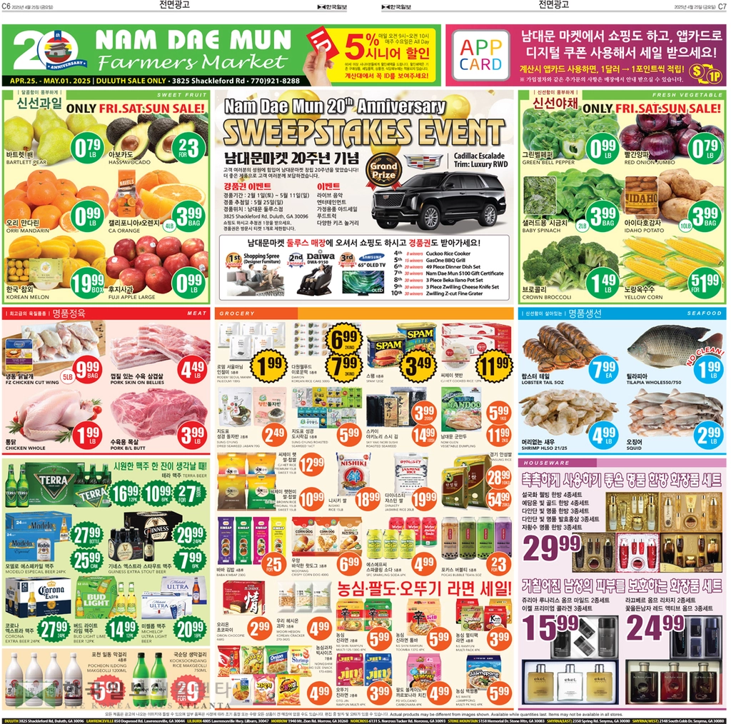 그로서리 코너에서는 CJ 햇반12PK 11.99, 경기 안성쌀10 KG 28.99, 경기 안성쌀20 KG 54.99, 스카이 야키 스시 노리 김 100매 14.99, 20매 3.99, 포천 일동 조 막걸리, 쌀 막걸리, 더덕 막걸리, 더덕 막걸리1200 ML 5.99, 국순당 생막걸리750 ML 2 for 9.00, 모델로 에스페카일 캔맥주 24pk 25.99, 코로나 엑스트라 병맥주 24pk 27.99, 기네스 엑스트라 스타우트 24pk 29.99, 6pk 7.99, 에스에프씨 스파클링 메론 ,자두, 망고, 수박, 깔라만시 소다6 pk4.99, 포카스 버블티 브라운 슈가, 허니듀, 마차, 타로, 타이 티16.5OZ 2 FOR 3.00, 남대문 만두 S 1KG 5.99, 남대문 만두 L 2KG 11.99, 스팸 클래식, 라이트, 스모크, 베이컨, 25%레스 소디윰, 메이플 맛12OZ 3.49, 씨제이 햇찹쌀, 햇현미쌀15LB 12.99, 씨제이 햇현미쌀, 햇현미찹쌀15LB 10.99, 니시키 쌀15LB 18.99, 다이너스티 쟈스민 쌀20LB 19.99에 판매된다.