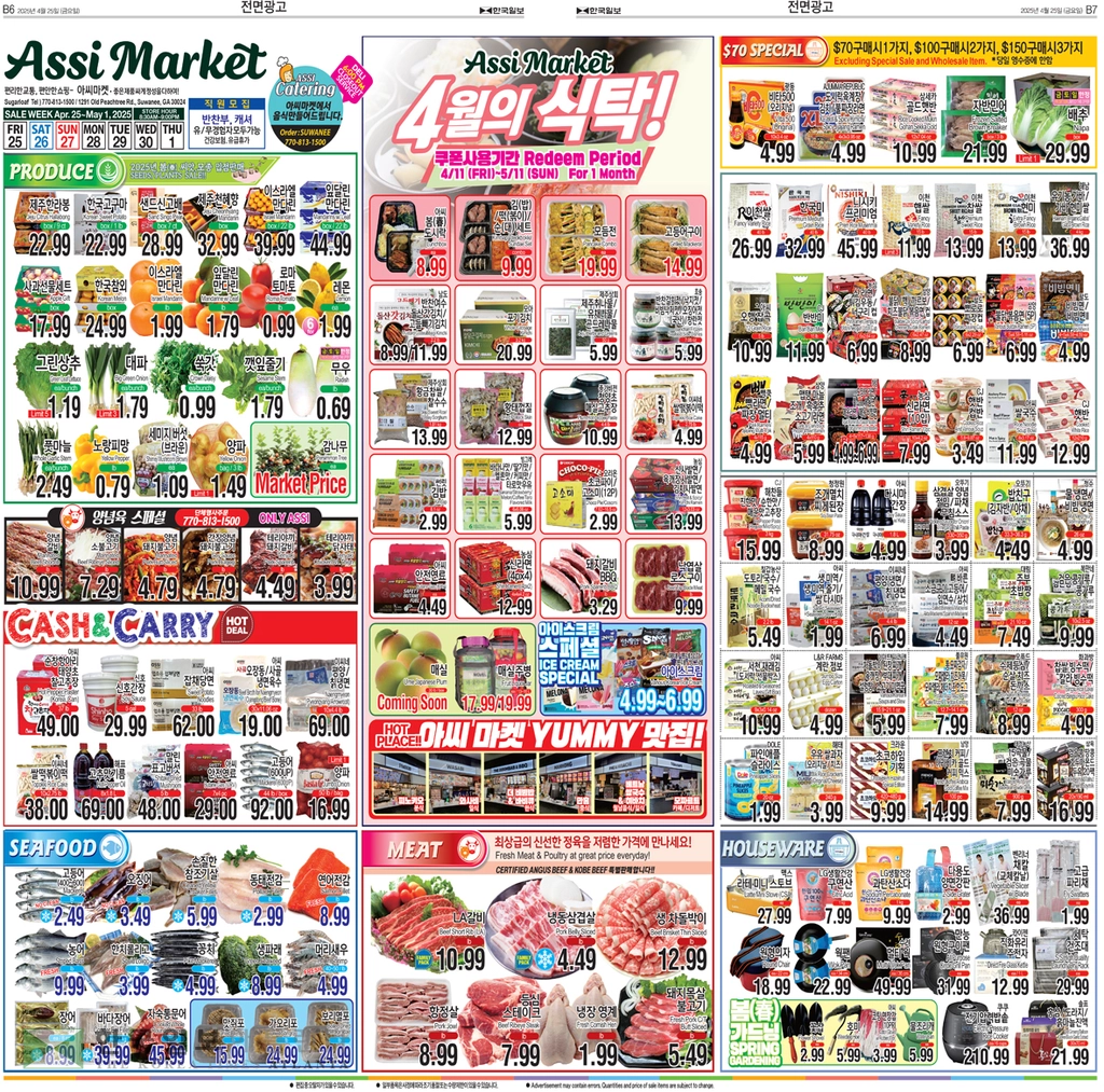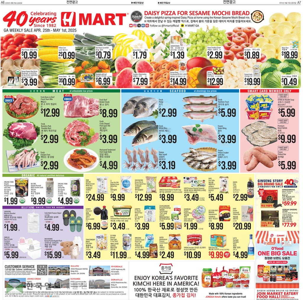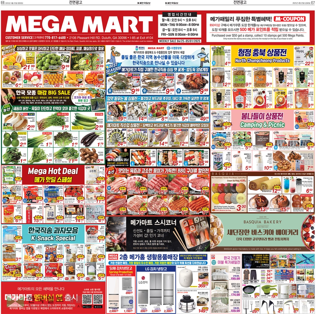 이번주 메인 품목으로는 봄(春) 도시락EA 8.99 모듬전SET 19.99, 고등어구이LB 14.99, 김(밥)떡(볶이)순(대) 세트PACK 9.99, 남도 반찬 여수 돌산 갓 김치 2.2LB 8.99, 고들빼기 김치2.2LB 11.99, 모아 포기 김치 3.2KG 20.99, 제주상회 제주 취나물 50 G 5.99,효송 반찬 갈치젓7.05 OZ 5.99, 반찬 낙지젓7.05 OZ 5.99, 제주상회황금 찹쌀1.81 KG 13.99, 황태껍질EA 2.99, 아씨 청양초 매실 고추장4.4LB 10.99, 이씨네 쌀떡볶이떡 2.75LB 4.99, 썬릿불고기 김밥8.1 OZ 2.99빙그레 바나나맛 우유5.99, 오리온 초코파이 2.99, 오리온 고소미 (12P) 2.99, 농심신사발면13.99, 돼지갈비 BBQ LB 3.29, 낙엽살 로스구이LB 9.99, 명가삼각 김밥김 (W/김밥틀)0.35 OZ 4.99, 아씨 안전연료EA 4.49등이 선보인다.